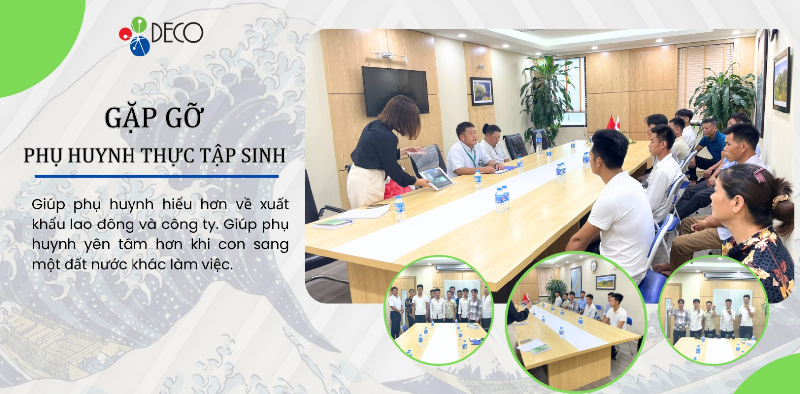 👉Ngày 15/12 vừa qua, DECO đã tổ chức buổi gặp mặt giữa nghiệp đoàn và phụ huynh giúp gia đình thực tập sinh hiểu hơn về công việc sắp tới con em mình sẽ được trải nghiệm và tạo được sự yên tâm nhất định đối với phụ huynh khi con em và gia đình đã đặt niềm tin thi, theo học tại DECO.